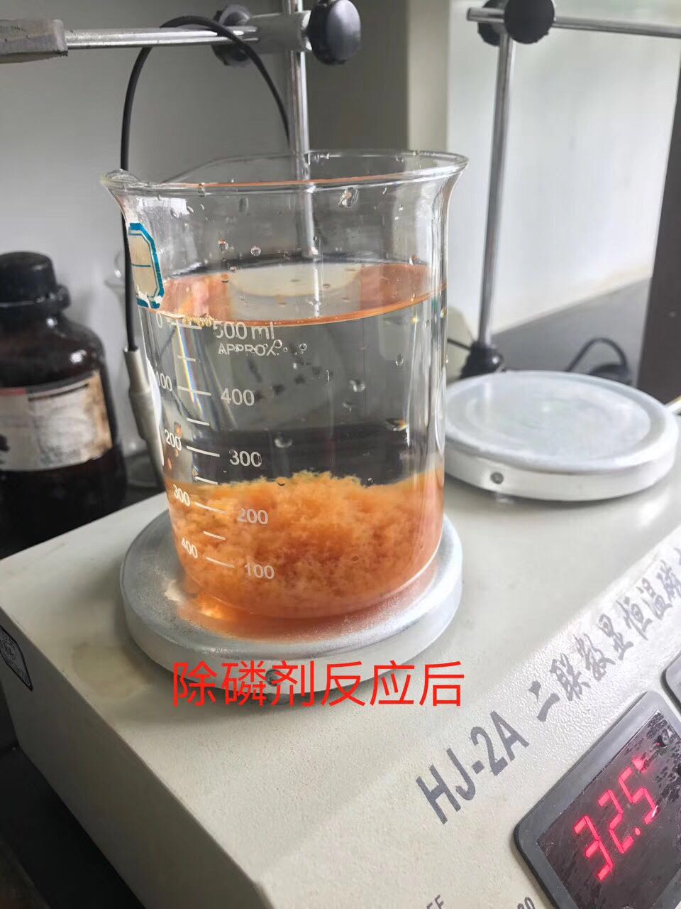 实验时取一定量的原水,加入适量的本产品(如500ppm),将废水pH值调节至7~8,加入少量聚丙烯酰胺PAM絮凝沉淀,过滤取上清液测定磷的含量。(如需处理重金属,用上清液进行二次处理即可。)