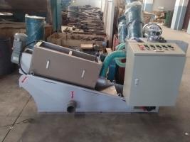 污泥在浓缩部经过重力浓缩后,被运输到脱水部,在前进的过程中随着滤缝及螺距的逐渐变小,以及背压板的阻挡作用下,产生极大的内压,容积不断缩小,达到充分脱水的目的。