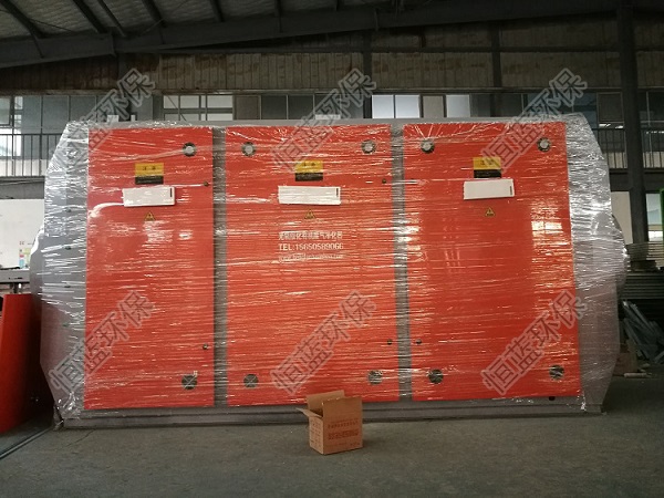恶臭气体利用排风设备输入到本净化设备后,净化设备运用高能UV紫外线光束及臭氧对恶臭气体进行协同分解氧化反应,使恶臭气体物质其降解转化成低分子化合物、水和二氧化碳,再通过排风管道排出室外;