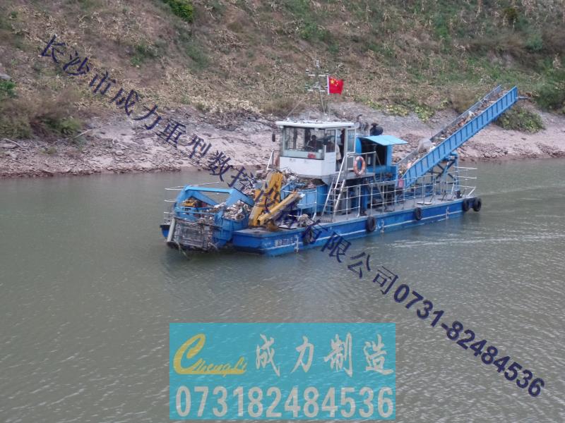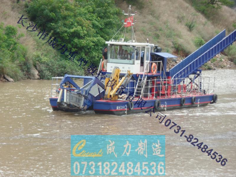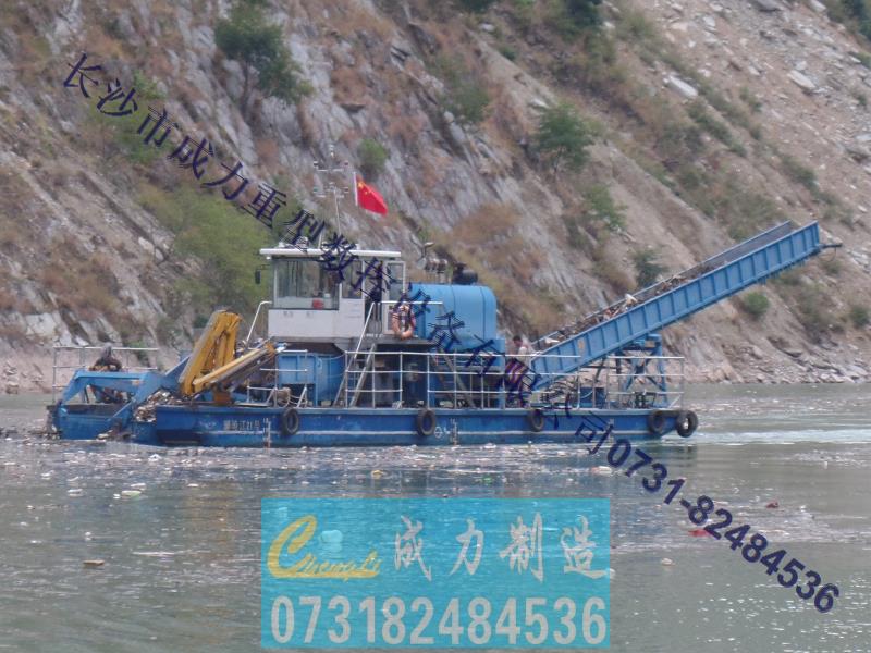 双体船设计,中间水道自成。船航行时,打捞带适时的开合,实现垃圾的自动化收集;生成的水流,使漂浮的垃圾,形成自然的聚拢效应,导入收集带,随不锈钢传送带向上移动,输送进存储舱,完成清漂打捞作业,收集效率较单体船更高。航行时,打捞带适时提升出水面,减小航行时的阻力;航速在 12-15 km/h,船原地回转,清扫大面积细小浅水面垃圾,原地回转能够达到 1 圈/2 分钟。艉部液压舵桨装置,可适时提升至甲板平面,方便及时清理缠绕垃圾和检修螺旋桨。船的驾驶1人就能完成,另1人只需做一定的巡视工作,降低了行船时,船员的劳动强度。不锈钢传送带牢固、耐用,由液压马达带动,运行平稳,无卡滞。艉部传送带长达 14 米,可将收集垃圾自动传送到 10 米高层的码头。