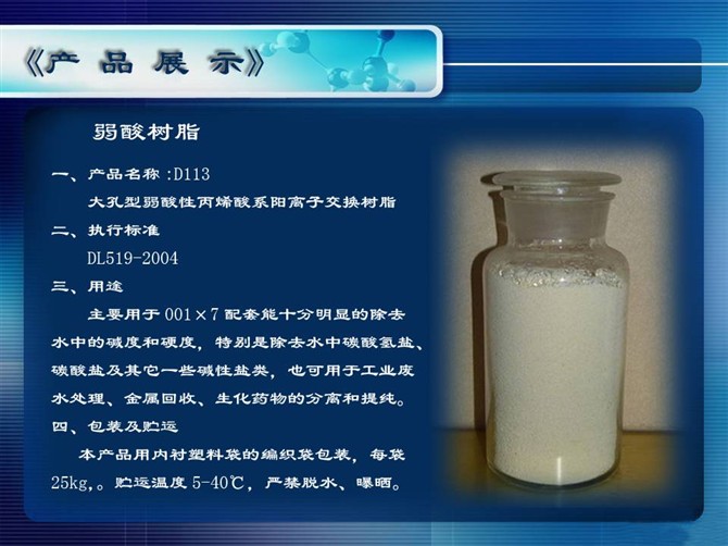一.D113树脂产品简介:D113是在大孔结构的丙烯酸共聚体上带有羧酸基(-COOH)的阳离子交换树脂。