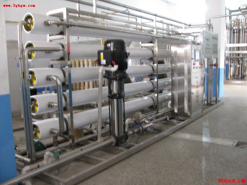 当纯水和盐水被理想半透膜隔开,理想半透膜只允许水通过而阻止盐通过,此时膜纯水侧的水会自发地通过半透膜流入盐水一侧,这种现象称为渗透,若在膜的盐水侧施加压力,那么水的自发流动将受到抑制而减慢,当施加的压力达到某一数值时,水通过膜的净流量等于零,这个压力称为渗透压力,当施加在膜盐水侧的压力大于渗透压力时,水的流向就会逆转,此时,盐水中的水将流入纯水侧,上述现象就是水的反渗透(RO)处理的基本原理。