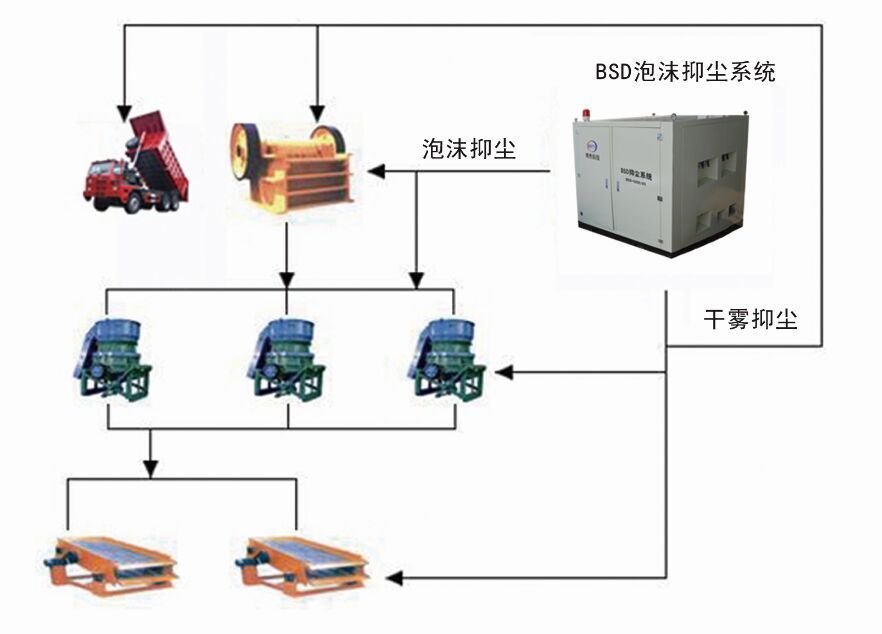 1、泡沫抑尘是将泡沫抑尘专用液与水按照一定比例混合后,在压风作用下通过专有设备,形成大量的泡沫粒子群,喷覆在矿石表面和上空,使整个破碎区域被无缝隙的泡沫体覆盖。产生的粉尘通过与泡沫体的碰撞截留、粘附、湿润等多种作用下,由小颗粒聚集成大颗粒,最终同破裂的泡沫滴液一起沉降下来,从根本上阻止尘源向外扩散,使得矿石在整个加工过程中都能有效地抑制粉尘的散发。