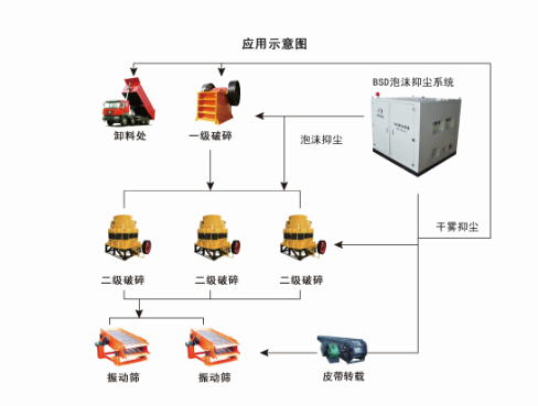 1、泡沫抑尘是将泡沫抑尘专用液与水按照一定比例混合后,在压风作用下通过专有设备,形成大量的泡沫粒子群,喷覆在矿石表面和上空,使整个破碎区域被无缝隙的泡沫体覆盖。产生的粉尘通过与泡沫体的碰撞截留、粘附、湿润等多种作用下,由小颗粒聚集成大颗粒,最终同破裂的泡沫滴液一起沉降下来,从根本上阻止尘源向外扩散,使得矿石在整个加工过程中都能有效地抑制粉尘的散发。
