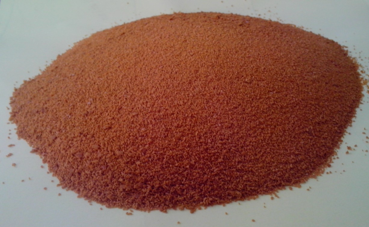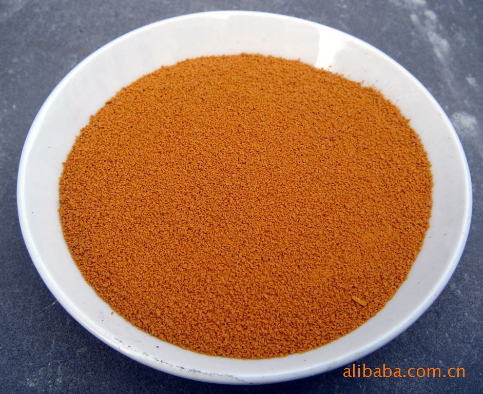 2、固态产品为棕褐色,红褐色粉末,极易溶于水。