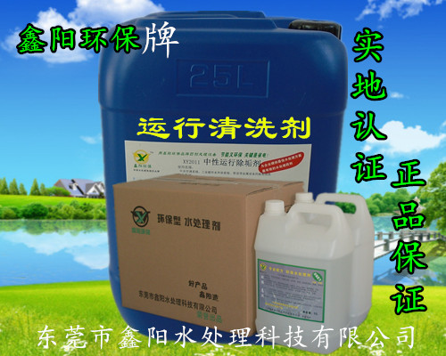 算好总水量,加药为5KG/吨水,可一次性投加,或分2-3次加入系统,每隔10—15天加一次,正常运行清洗30—45天左右,垢会在这段时间内慢慢溶解清除干净。投加时先排出总水量的5%后,再把药剂加入冷却塔或水池内,然后随补水将药剂从膨胀水箱投入,再补足水量正常运行。在设备运行中清洗,省时省力,清洗效率高,不影响设备正常运作;鑫阳环保牌运行除垢剂在中性环境下清洗,对设备无腐蚀,能清洗各种水垢及难溶垢以及微生物粘泥;