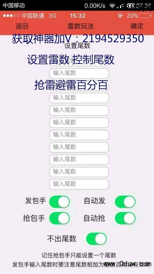功能综合:秒抢.延时秒数.看穿包.不抢最小包.双尾.不小最小尾数包.随意抢包设置.金额单位安全值设置.中间抢.排名位置雷.各种位置数值 设置等......