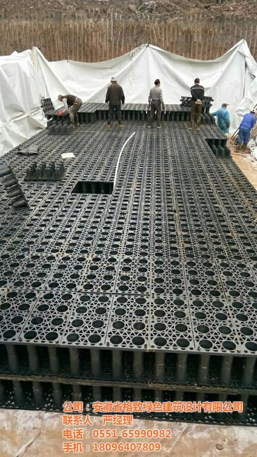 1.雨水蓄水模块:‘采用聚丙烯材料制作成不同规格尺寸的网格状平板,通过拼装成模块化尺寸的箱体,将每一个箱体码放成为连续的雨水“矩阵”池。因为其网格化透空的结构,材料的结构占用空间不到5%,即模块的蓄水空间达到95%以上,雨水可以在其中自由交换流动。雨水蓄水模块直接安装在地面以下,不占用地表使用空间,隐蔽性好,可阻隔阳光照射,且模块材料可靠,可使雨水长期储存而不发生变质。模块组合式拼装,简单灵活且结构坚固,单个模块承压能力达30吨/平米,安全可靠。