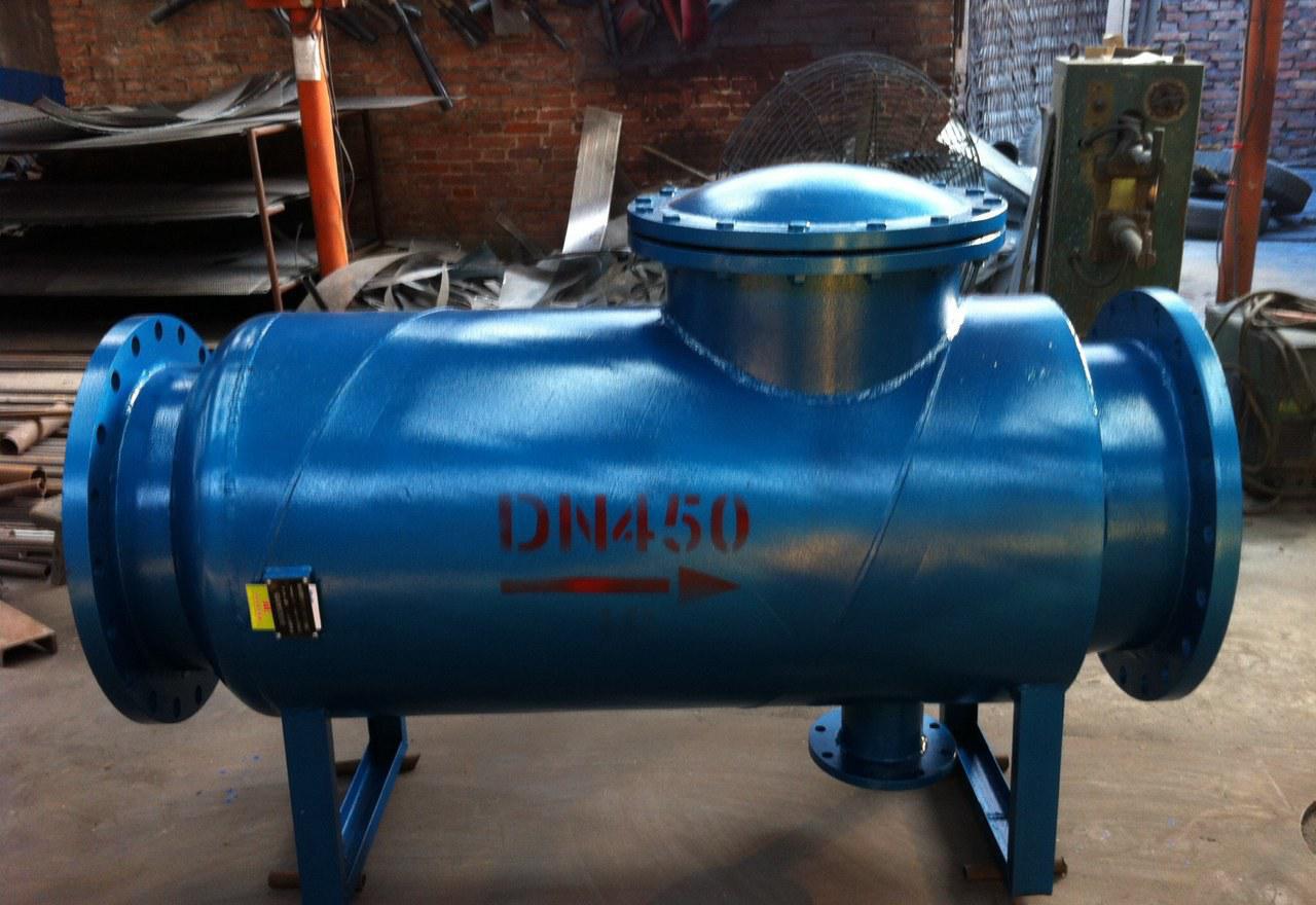 卧式直通除污器设备由过滤器本体、转向阀、滤网、排污口组成。被处理水通过进水口进入过滤器本体,水中杂质便会截留在不锈钢滤网上,当杂质堆积到一定程度时,滤网内外两侧的压差达到设定值(≤0.05MPa),打开排污阀,关闭转向阀,除污器开始排污。