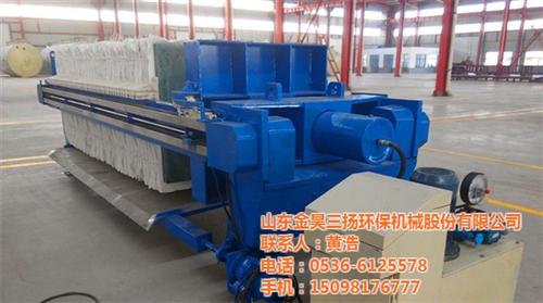 板框压滤机有手动压紧、机械压紧和液压压紧三种形式。手动压紧是螺旋千斤顶推动压紧板压紧;机械压紧是电动机配H型减速箱,经机架传动部件推动压紧板压紧;液压压紧是有液压站经机架上的液压缸部件推动压紧板压紧
