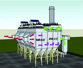 烟气除尘系统,锅炉燃料在燃烧过程中除放出大量热量外,还会产生大量烟气。烟气是气相物质和固相物质的混合体。气相物质主要包括二氧化碳、二氧化硫、一氧化碳、碳氢化合物、氮氧化合物、氮气、氧气等。固相物质即为烟尘。由于烟尘的存在,锅炉排烟呈灰色甚至黑色。"烟"是指烟炱,即是烟气中的可燃气体由于不完全燃烧,在高温下还原产生的极细微的粒径小于1微米(μm)的炭粒。在空中形成黑烟。"尘"是指在燃烧过程中,由高温烟气带出的飞灰和一部分未燃尽的炭粒,其粒度较大,约在1微米(μm)到100微米(μm)之间。要消除"烟",应从改进燃烧(燃烧设备、燃烧条件和操作水平)着手;要消除"尘",应从改变烟气流速和采用有效的除尘设备着手。