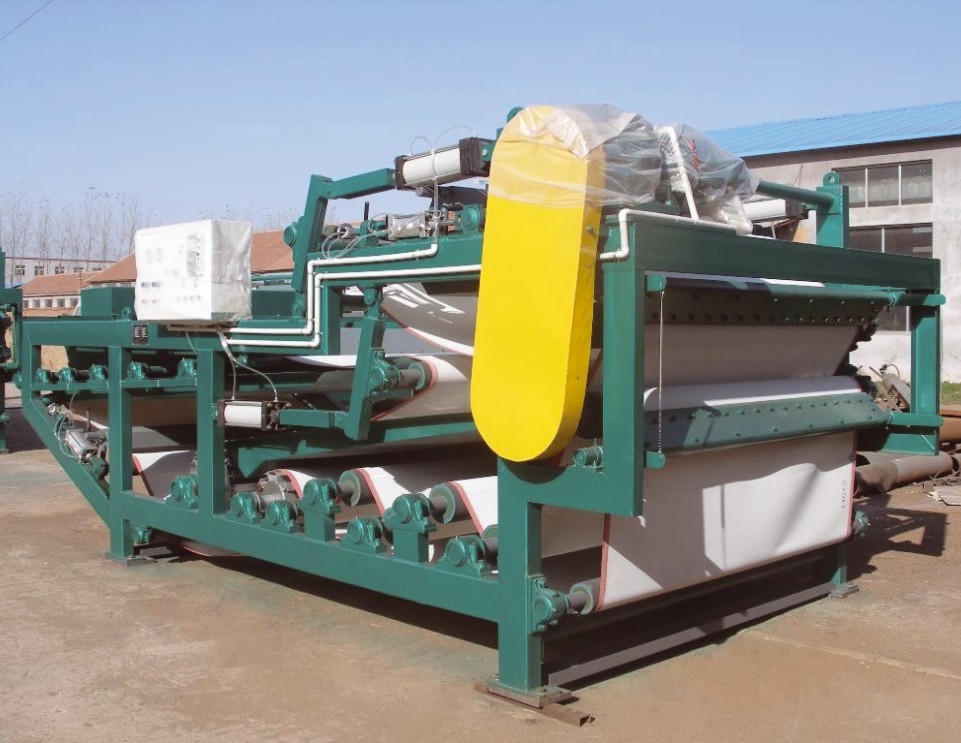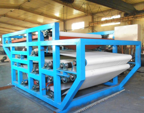 该系列压滤机由导向导辊,压榨辊和上下滤带及滤带张紧、纠偏、冲洗、调整等装置组成。其压榨辊呈S状布置,并且压榨辊直径由大而小排列,使滤带与压榨辊接触面大,压榨时间长,污水受到的压力较小而缓合。上下滤带以相同方向,相同速度运行,靠滤带的张力产生对污泥的压力和剪切力把污泥中的毛细水挤压出去,达到污泥脱水之目的。