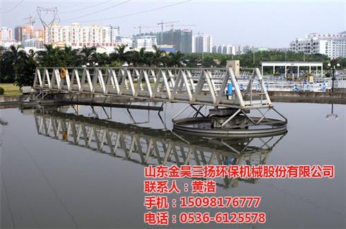 该设备采用移动桥式,吸泥方式分为虹吸式(简称桁车式刮泥机)和泵吸式(桁车式刮吸泥机)两种类型,一般地面式沉淀池选用虹吸式吸泥机,半地下式沉淀池选用泵吸式吸泥机。当吸泥机不工作时,即停在进水端;当吸泥机工作时,行车在电气控制的指令下,当顺水流行驶时,先放下撇渣板,刮集浮渣并撇向池端钢制撇渣槽内;反向行驶时,撇渣板提升,离开液面以防浮渣逆行;通过控制电磁阀换向阀,使冲洗水进入钢制撇渣槽内;池底泥水则由吸管(通过虹吸或泵吸)将其排入池边集泥槽内,进行下一步处理,依此作往返工作运动,从而达到吸泥、排泥、撇渣的目的
