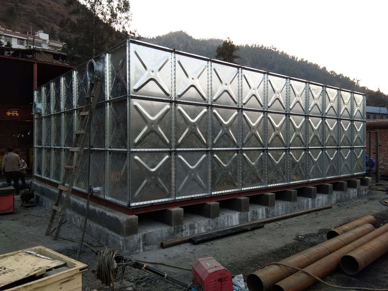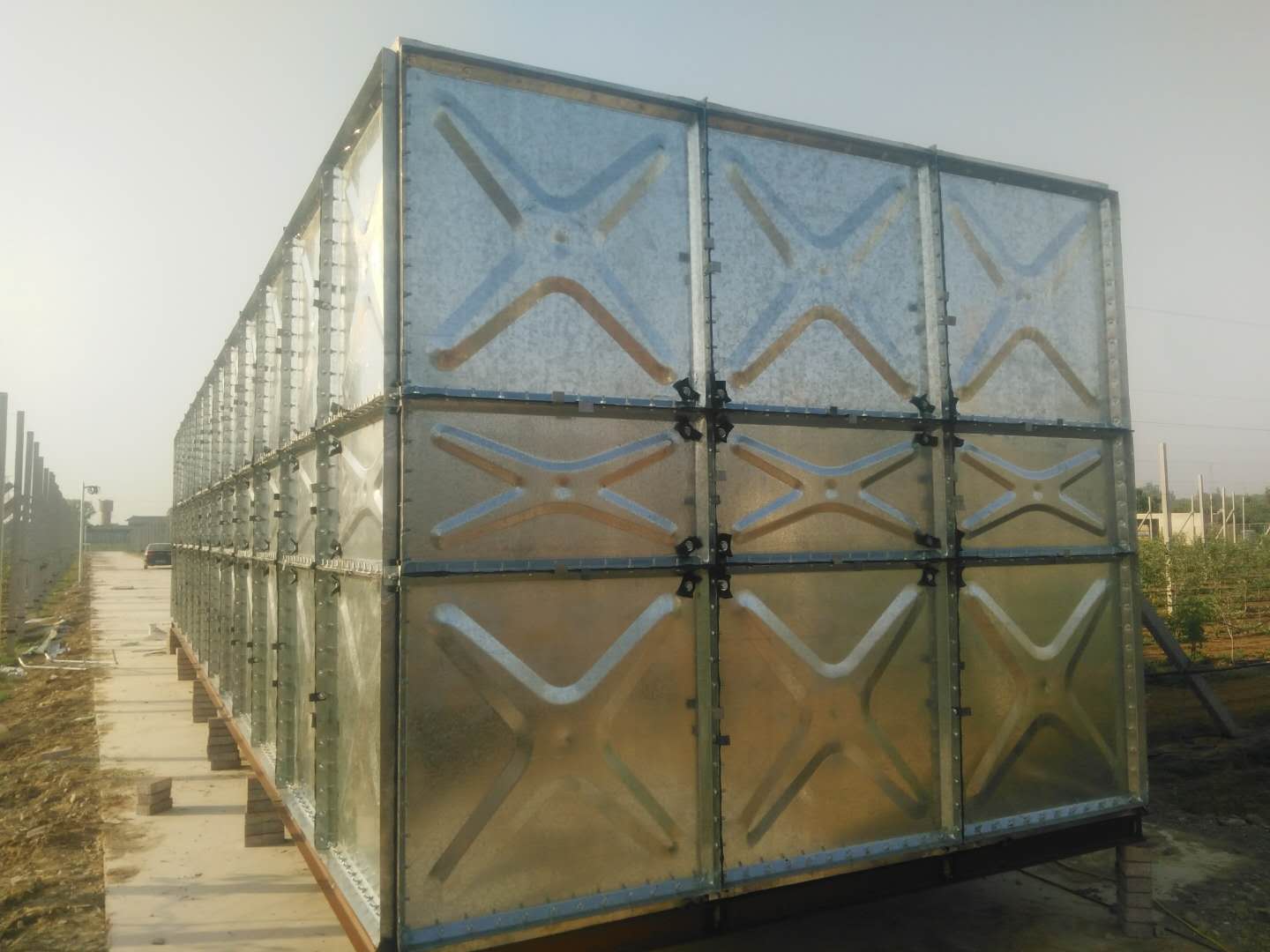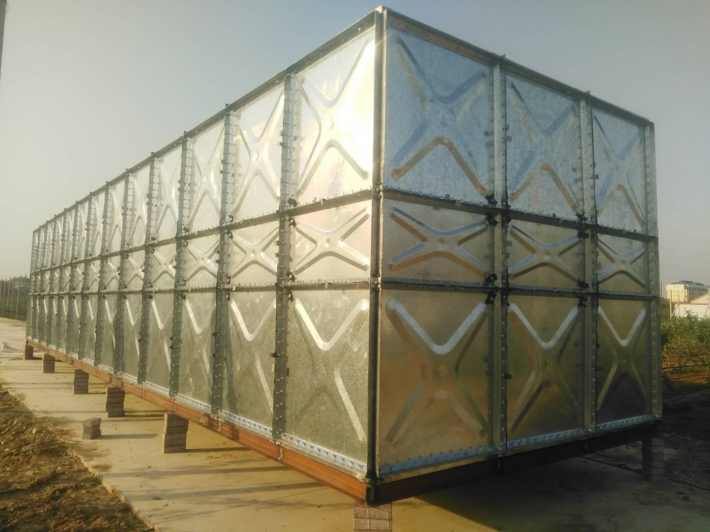 镀锌水箱是按照12S101矩形给水箱图集采用Q235钢板制造生产的新型钢板水箱,冲压形成1000×1000和1000×500标准块,四周钻孔,经热镀锌处理,现场进行安装,组装时标准块之间夹无毒耐高温橡胶垫,螺栓连接。制造、安装均不受土建施工影响,不用焊接设备,表面采用热镀锌防腐处理,美观耐用,防止水质二次污染,并符合建筑产品标准化、系列化、工厂化要求。