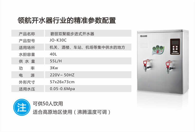 自来水经蒸汽热能回收器预热后,再进入水箱底部,进水量达到低水位探针后,马上通电加热,即开即饮,并分层煮开,杜绝了普通开水器生水混合、千沸水的现象。