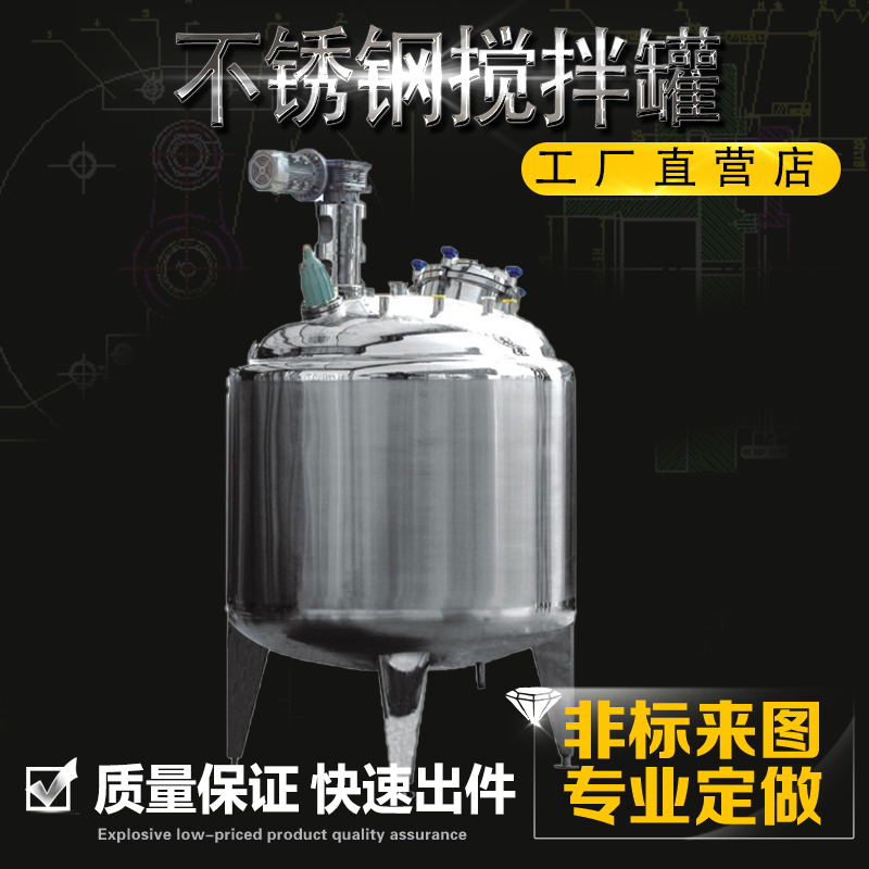 另外,还配有温度控制装置、测温孔、CIP自动旋转喷洗球、消泡器、挡板、空气分布器、温度传感器、视镜射灯、液位计等设备。不锈钢搅拌罐由搅拌罐体、上下端头、搅拌器、支承、传动装置、轴封装置等组成,还可根据工艺要求配置加热装置或冷却装置。不锈钢搅拌罐和搅拌罐盖可以是法兰或焊接的。根据工艺要求,搅拌罐罐盖可用于打开进料,排料,观察,温度测量,压力测量,蒸汽分馏,安全排气和其他工艺管孔。电动机放置在不锈钢搅拌器盖的上部,搅拌罐中的搅拌器由驱动轴驱动。轴封可以是各种形式,例如机械密封或填料,迷宫式密封等。搅拌器可以以各种形式配置,例如锚式,框式,斜叶桨式和三叶桨等。