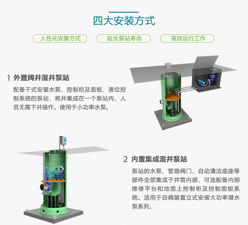 一体化泵站占地面积小,露出地面仅需传统泵站的1/5甚至更少。一体化泵站采用自流清渣底座,能避免恶劣工况下人工频繁清渣和打捞。一体化泵站采用智能化监控系统和远程管理控制,实现远程操控,无人值守。一体化泵站选用螺旋式高效潜水泵,无堵塞、无缠绕带搅匀功能,有效提升排污能力,应用于河道污染治理污水截污、小区污水雨水排放、城镇低洼地段的雨水排放、污水雨水管网长距离输送提升加压等领域。