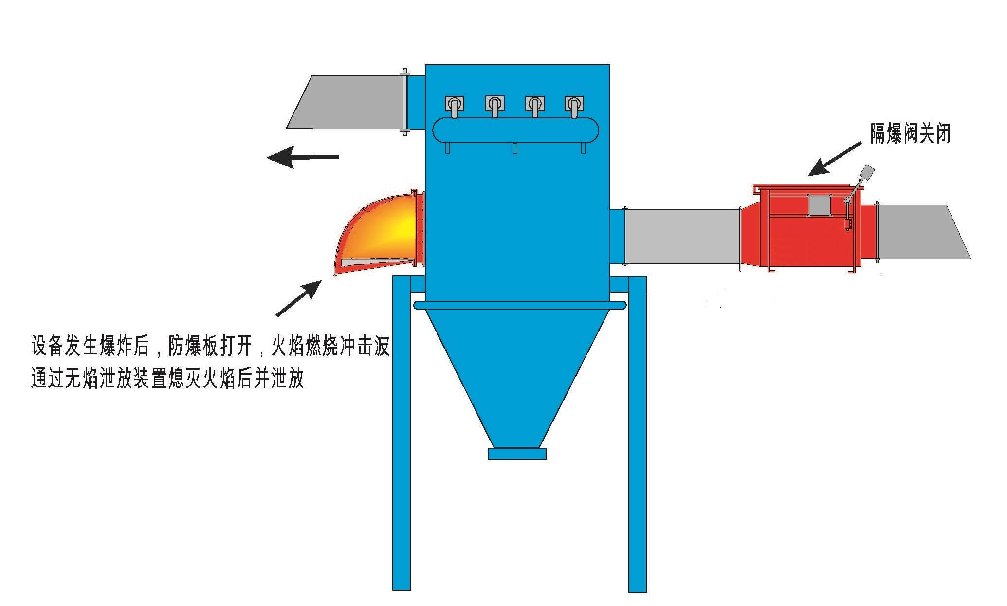 当除尘器或粉尘收集器发生粉尘爆炸时,在正常的爆炸泄压中,火焰是自由泄放的。当设备安装于室内时,自由泄放的爆炸火焰及冲击波,会引起二次爆炸,造成更大的损失。无焰泄放装置设计用于保护人员和设备免受粉尘爆炸破坏。在发生粉尘爆炸时,爆炸产生的火焰通过装置的灭焰装置而被熄灭,爆炸产生的压力波被排出。