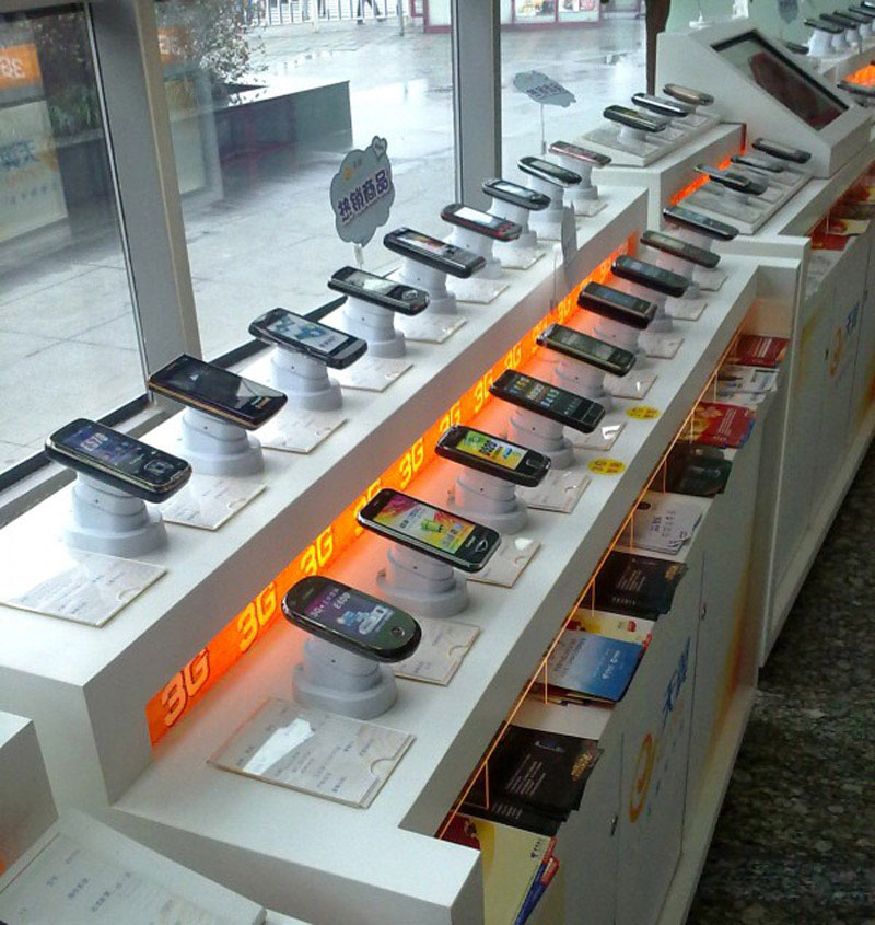 本产品手机安全防盗架是专为手机、数码相机、MP3、MP4、GPS等数码电子产品经销商及用户设计开发的一款防盗保护装置,产品主要包括固定在手机上的模块、钢丝绳自动回缩装置、固定底座、3M胶等组成,具有外观时尚、体积小巧、安装便捷、性能可靠等特点,可以安装在陈列橱柜的任何角落,也可以安装在陈列架上。