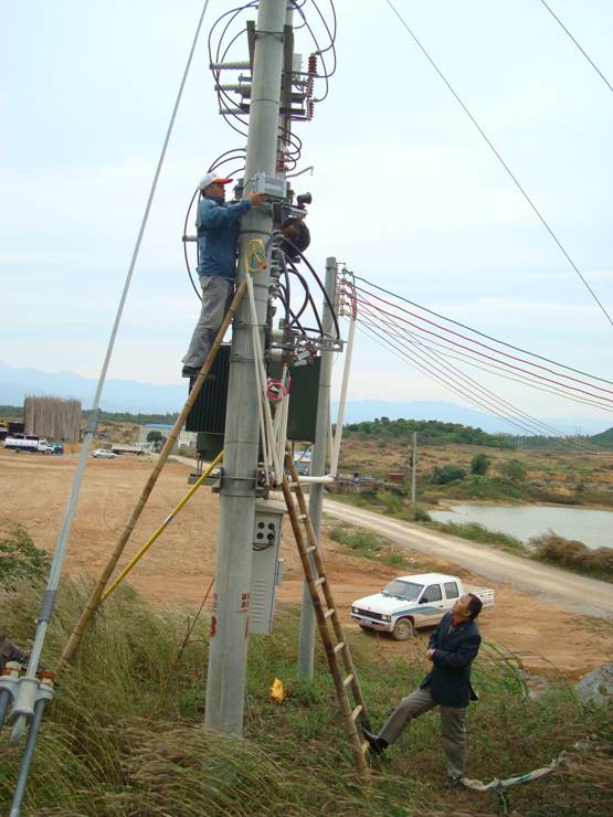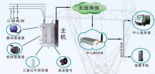 电力变压器防盗器的原理: 无线监测报警主机安装在被监控电力线的电杆上或变压器旁,电力线或变压器一旦被盗、三相断线或停电,监测报警主机立即探知并以无线GSM短信息和语音方式向GSM接收主机报警,接收主机收到报警信号后将数据传送给微机,微机经接警软件分析判断报警主机及可能出现故障的线路后声音报警,屏幕显示报警日期、时间、报警分机号、故障变压器及可能的故障线路,并以电子地图方式显示报警变压器及故障线路的实际地点,将报警数据存入数据库以备查询。值班领导得到报警后立即派警力到现场查验情况,处理有关问题。