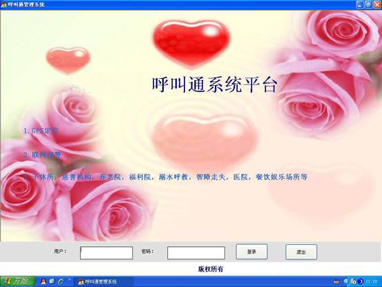 (1)“呼救系统”智能接警管理系统网络运营版的初始平台能够方便准确地对用户“平安钟”,“呼救通”所发出的告警信息进行识别和处理,并将警情通过语音系统通知到用户手机、座机、小灵通等通讯设备,同时前端主机和平台对应有巡检功能,避免出现平时不用,用时不灵的情况。