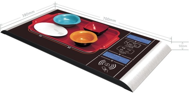 3、 托盘放入结算区,显示屏会立刻显示出菜品名称、价格等信息,同时系统语音提示“请付款”,操作员与顾客确认无误后将智能卡放在刷卡区就可完成结算,结算成功或失败系统都会有语音提示。