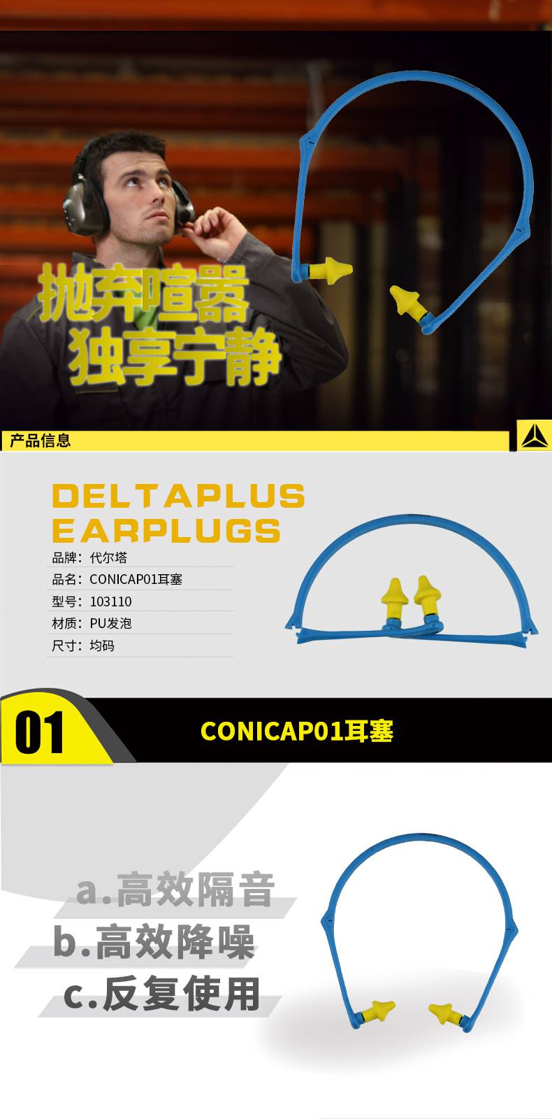可重复使用聚氨酯(PU)耳塞,由可折叠聚丙烯材质拱形头箍连接,悬于下颚;可折叠,便于携带。该产品适于偶尔或短时间使用。每副单独包装。可用我公司CONICAP01BR更换PU耳塞。