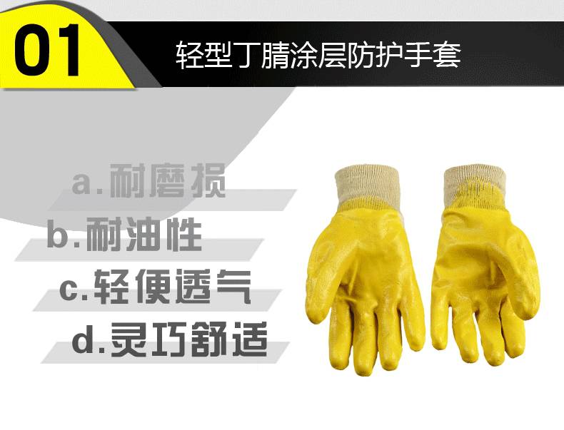 产品描述 :轻型丁腈涂层针织手套,涤纶纤维,在保证防护效果的同时比重型丁腈手套具有更优异的灵活性能,适用于化工萃取、模具铸造行业。