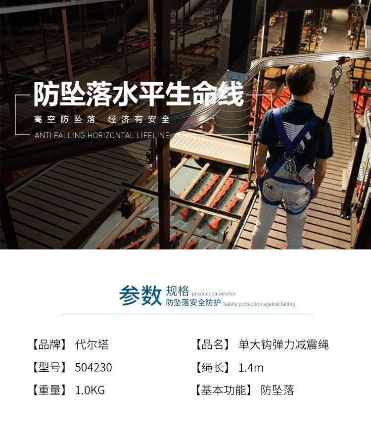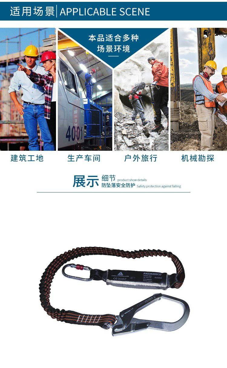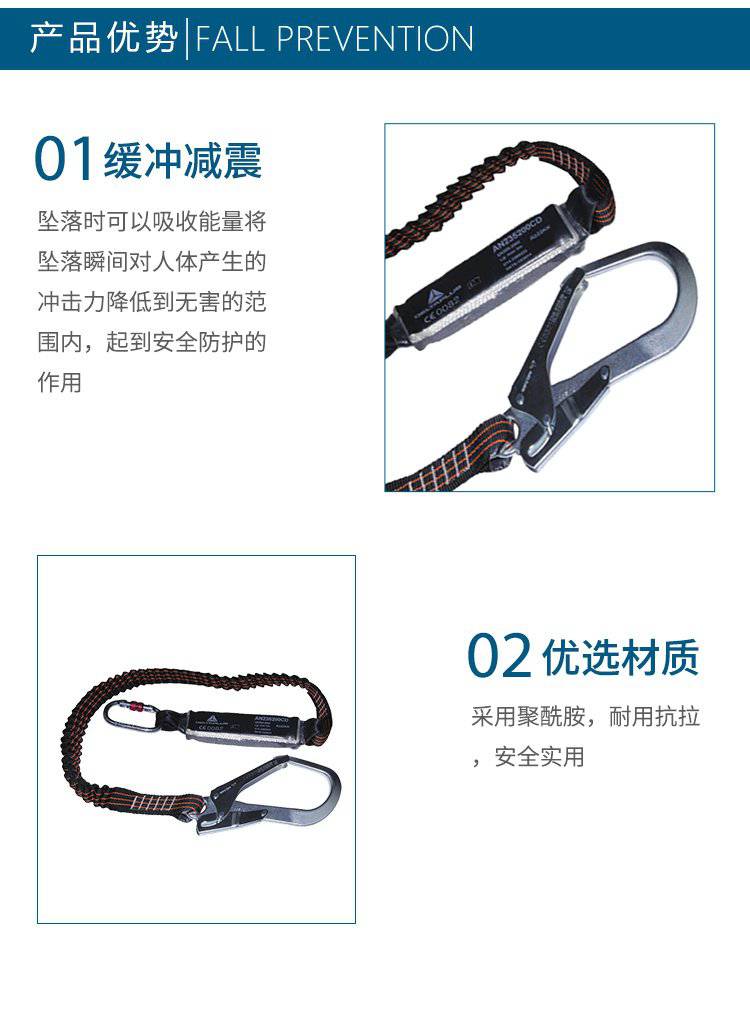 使用说明:本产品的使用人员须身体健康,经过专业训练并有着丰富的高空工作经验。减震带与连接器配套使用, 一端连接安全带,另一端连接固定点。连接器须符合EN362欧洲标准。减震带和安全钩总长度不超过2米。固定点应位于使用者上方,承受力应不少于15KN。使用之前对减震带、接口处、连接器等部件进行外观检测,确保减震带处于良好状态。检查减震带是否有任何损坏或破裂、断线、缝纫磨损、连接器生锈磨损等问题。不要使用已损坏或污染的减震带。曾经发生过坠落或检查过程中对其品质有质疑的劳保设备需退回到技术服务部门。在使用过程中,采取相应安排以保证减震器有效防护工作中的危险(燃烧、割裂、化学危险等)。减震器需由专业人士定期进行检查,每年至少一次。不能私自对产品进行