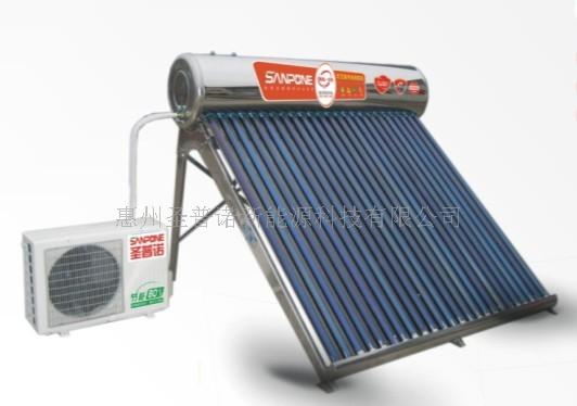 圣普诺太空能热水器是将太阳能热水器储水箱与空气源热泵冷凝器结合成一体,在立式或卧式水箱内安装热交换装置并与热泵工质循环管路连通。它主要由太阳能集热器、蒸发器、压缩机、冷凝器、热力膨胀阀储水箱等部件组成。在晴天,由太阳能真空管集热器吸收太阳辐射能用微循环方式直接加热储水箱内的冷水。当自动控制装置探测到太阳能水箱内的水温达不到设定值时,热泵开始工作并通过混合工质与水箱内的水进行热交换,最终保持水温稳定。热泵的工作原理是把环境介质中贮存的能量在蒸发器中加以吸收而蒸发,蒸发后的制冷剂被压缩机吸入并压缩成高温高压的气体,然后被排入设置在太阳能储热水箱底部的冷凝器中放热。制冷剂蒸气通过工质循环系统内,与水进行对流换热而得到冷凝,同时水得热而升温。冷凝器的工质经膨胀阀或毛细管节流又重新流入蒸发器中,由此完成一次工作循环。阴天或夜间,热泵蒸发器通过吸收环境大气中的低品热源,保障热泵正常工作,从而可以全天候的产生热水。