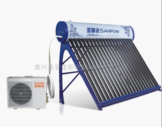 圣普诺太空能热水器是将太阳能热水器储水箱与空气源热泵冷凝器结合成一体,在立式或卧式水箱内安装热交换装置并与热泵工质循环管路连通。它主要由太阳能集热器、蒸发器、压缩机、冷凝器、热力膨胀阀储水箱等部件组成。在晴天,由太阳能真空管集热器吸收太阳辐射能用微循环方式直接加热储水箱内的冷水。当自动控制装置探测到太阳能水箱内的水温达不到设定值时,热泵开始工作并通过混合工质与水箱内的水进行热交换,最终保持水温稳定。热泵的工作原理是把环境介质中贮存的能量在蒸发器中加以吸收而蒸发,蒸发后的制冷剂被压缩机吸入并压缩成高温高压的气体,然后被排入设置在太阳能储热水箱底部的冷凝器中放热。制冷剂蒸气通过工质循环系统内,与水进行对流换热而得到冷凝,同时水得热而升温。冷凝器的工质经膨胀阀或毛细管节流又重新流入蒸发器中,由此完成一次工作循环。阴天或夜间,热泵蒸发器通过吸收环境大气中的低品热源,保障热泵正常工作,从而可以全天候的产生热水。