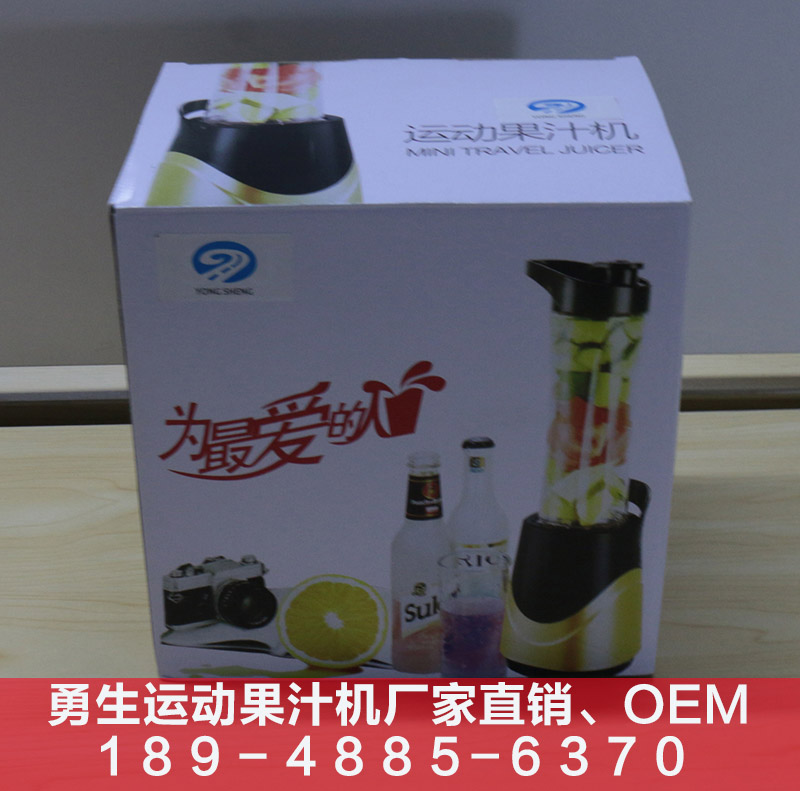 中山市勇生电器有限公司是一家专注运动果汁机生产加工销售为一体的企业,我们只专注运动果汁机的研发生产销售加工(包括代加工、OEM、ODM)业务,力争做榨汁机搅拌机料理机类目里运动果汁机(即便携榨汁机、运动杯式榨汁机、随行杯果汁机、迷你料理机、小型搅拌机)行业的隐形冠军。 公司实力雄厚,注册资金600万,生产工厂三千多平米,拥有自有运动果汁机品牌:勇生运动果汁机,运动果汁机是今年兴起的一款便携式榨汁机,是一款多功能料理机,因其便于携带、迷你、可榨汁可打粉可搅肉、容量刚好适合一到两人份量不浪费等优点,受到越来越多的家庭和个人消费者的喜爱,近年来国内外喜欢运动养生健康生活的人们越来越多,运动后来一杯自制果汁,更是很多人的优先选择。因此一种可以一次榨汁一水杯(600ML左右)的迷你榨汁机诞生了——它就叫运动果汁机,它拥有姣好的身材(漂亮的水杯容器,盖上水杯盖就可携带出门),才艺众多(不但可榨汁,还可磨粉、搅肉等),100%的为您的健康着想(为你榨出营养丰富搭配合理的果蔬汁等)。