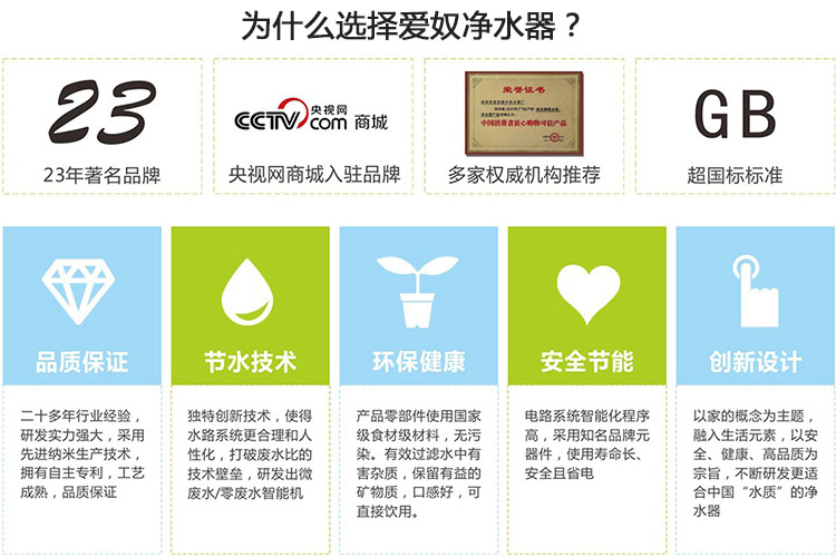 20多年专业及丰富经验,加上完善的管理体系,诚恳的负责态度,将是我们的竞争优势。我们同时强调售后品质与系列维护的重要性,唯有结合系统设计安装与维护。才能使系统挥最佳的作用。潘兴净水科技人以其著名“爱奴”品牌赢得了广大客户及净水行业的认可。公司先后荣获: “中华人民共和国卫生部国家涉及饮用水安全产品卫生许可批件”、“中国疾病预防控制中心检验合格”、“ISO9001:2000质量管理体系”、”3C、CQC、ROHS、CE"“中国知名净水十佳品牌”、“质量、信誉双保障示范单位”、“中国消费者放心购物可信产品”、“中国绿色环保产品”、“中国著名品牌”、“商务机领先品牌”等一系列殊荣。