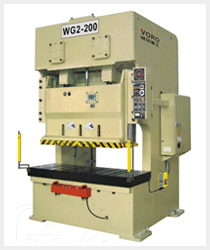 WG-2?(系列开式双曲轴压力机)适用于长面宽钣金物料之剪裁、冲孔、弯曲等多用途加工,如马达外壳、汽车零件、家用产品、电脑主机外壳、录音机及音乐底盘、电源供应器底盘等。其宽敞的台盘和开口不仅有利于单工程或多工程模式的作业,对二次元、三次元的自动移送装置或配有伺服传动的机械手亦能轻易配合,从而达成多用途的自动送料。