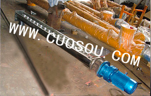 旋转的螺旋叶片将物料推移而进行螺旋输送机输送,使物料不与螺旋输送机叶片一起旋转的力是物料自身重量和螺旋输送机机壳对物料的摩擦阻力。螺旋输送机旋转轴上焊的螺旋叶片,叶片的面型根据输送物料的不同有实体面型、带式面型、叶片面型等型式。螺旋输送机的螺旋轴在物料运动方向的终端有止推轴承以随物料给螺旋的轴向反力,在机长较长时,应加中间吊挂轴承。