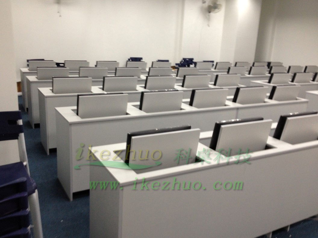 科桌 翻转电脑桌主要应用于各种大型会议室,学术报告厅,计算机教室,多媒体教室、多媒体会议室、多媒体电子教室、多媒体电教室、机房、培训中心,展厅内及多功能会议厅等。普通教室与计算机教室模式相互切换快速,不阻碍老师与学生之间目光交流,当需要使用显示器时轻按前端桌面板隐藏在桌子内部的显示器会自动从桌子下面升到桌面翻转到合适角度。当不使用显示器时,可手动按下显示器翻盖面板至桌面平整,显示器自动锁住隐藏在桌子内与桌面保持平整一致。起到防尘,防盗,保持桌面平整美观。使用方便,手动控制,翻转自如。