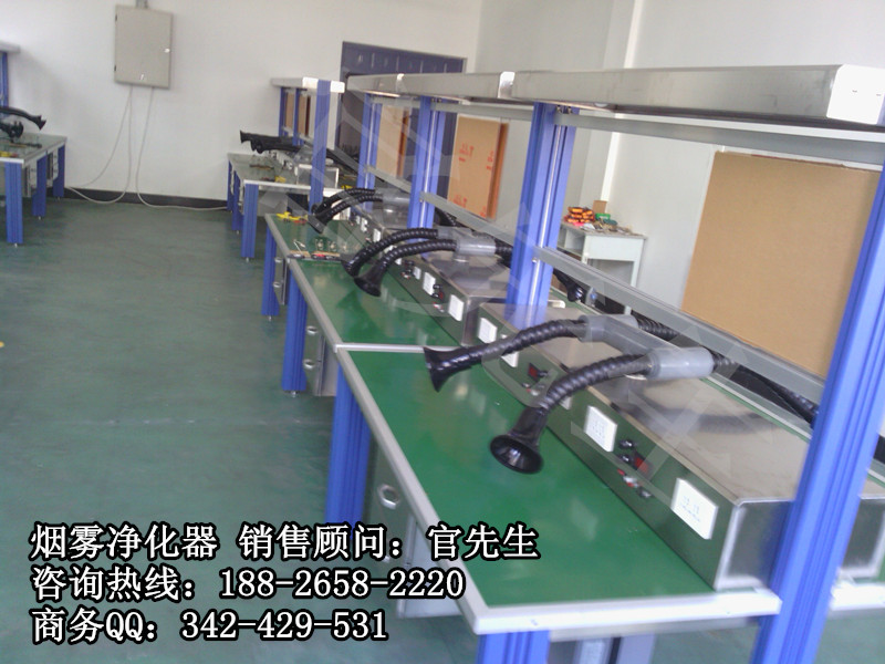 而另外有5%是以气体方式散发在空气中,我们的肉眼是看不到的,而这些气体中含有大量的一氧化碳、二氧化碳、甲醇、乙醇、甲烷、甲醛等有害性成分。这些微粒和有害性气体会影响操作者的健康及污染环境。 烟雾净化系统是通过各种适合的收集器(烙铁抽烟管/吸烟手臂/吸烟罩等)通过安装在各工位的管道收集到除烟系统的设备中,被系统内部的过滤器过滤后排出。