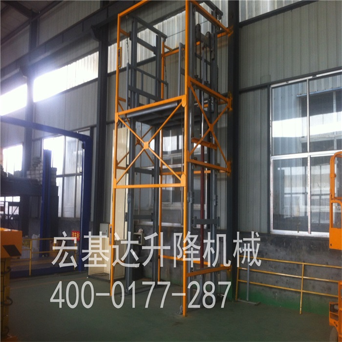济南宏基达升降机械有限公司生产的导轨链条式升降机是一种非剪叉式液压升降台,用于二层以上工业厂房、餐厅、酒楼货物运输,由于最低高度仅150-300mm,最实用于不能开挖地坑的工作场所,同时无须上部调点,具有多种形式(单柱、双柱、四柱),动作平稳、操作简单可靠,液压、电器多种货物传输经济、轻松。(具体承载力及升高层数、尺寸可根据用户要求设计制作)