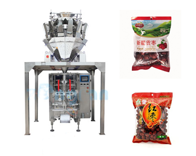 红枣自动包装机由给袋式全自动包装机与组合秤、Z型提升机、工作平台配套组合而成,适合各类颗粒、片状、条块干散物料(如:红枣、坚果、薯片、葡萄 干等)的全自动计量包装,可自动完成计量、制袋、包装、封口、打印、计数等整套包装流程。广泛应用于食品、药品、化工、添加剂等诸多行业,整机设计符合 GMP标准,可与配料及自动装箱设备连接组成配料包装生产流水线。