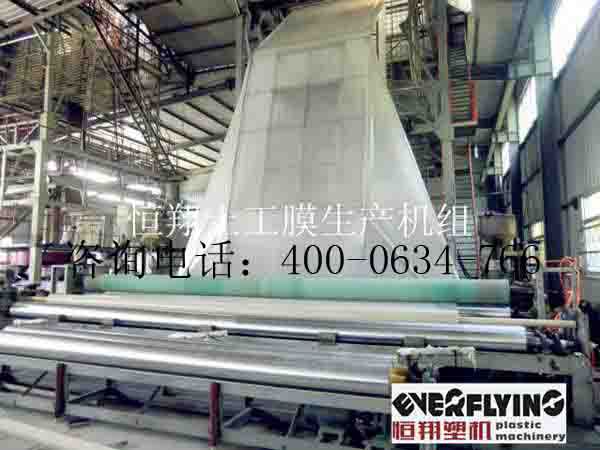 该设备主要用于生产三层复合塑料宽幅防渗膜、土工膜等产品。主要由三台挤出机、液压不停机快速换网装置、三层复合机头、双风口风环、牵引机、卷取机、温度与电器控制等系统组成。