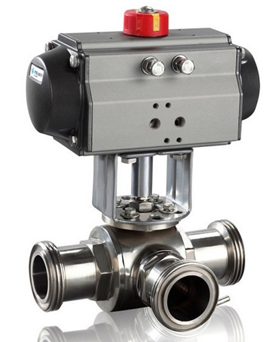气动三通卫生级球阀是通过电磁换向阀改变气路方向,控制执行气缸来驱动球阀,达到接通或切断真空(压力)系统管道路中的介质流。应用于真空、乳制品、酒业、生物工程、食品、制药、饮料、化妆品及化工领域。可选配反馈信号装置及电气阀门定位器。