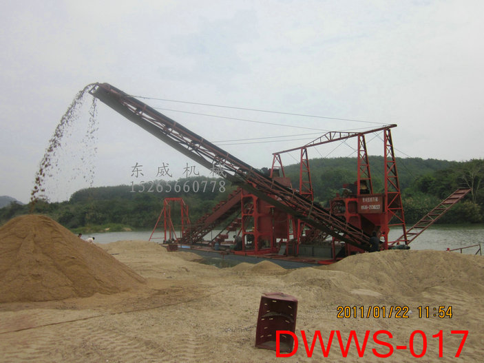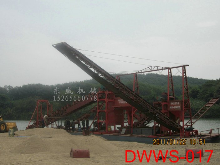 挖沙船是本公司主打的产品之一,主要技术人员参加了挖沙船的研发,并不断进行创新,使其更加完美。挖沙船属于链斗式的水上挖掘机械,可同时完成采掘、筛选、清洗、选矿、打堆等工艺,一次性生产出合格干净的砂石产品。还可加装破碎机或洗沙机进行二次洗选。