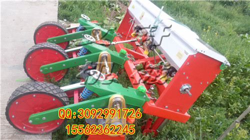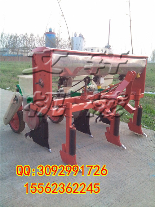 该机与拖拉机配套作业,主要用于免耕地单粒精播或双粒精播玉米,可条施晶粒状化肥,一次完成开沟施肥、开种沟、播种、覆土、镇压等项等工序,两行机添加铺镆机构可以完成地膜覆盖。