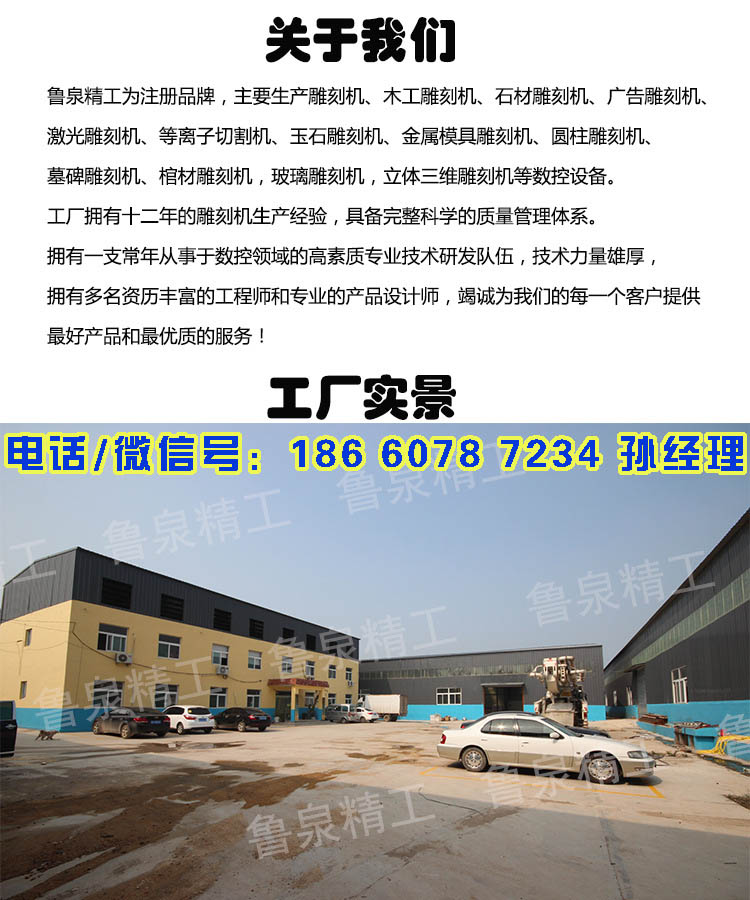 公司坐落于山东的省会城市——济南。占地面积近万平方米,是济南知名的大型数控机械设备研发生产厂家之一。我公司生产的产品远销中东、东南亚等国外地区。 我公司下设专业的研发部门,根据我国各地区的特点,专业研发设计最适合国内使用的机械设备,并且拥有多项国家专利技术。 三格全自动数控石材雕刻机(墓碑雕刻机、石碑雕刻机、墓碑刻字机、墓碑喷砂机等)空行速度可达30米/分钟以上,加工速度可达13米/分钟,一次下刀可达5-8mm以上。