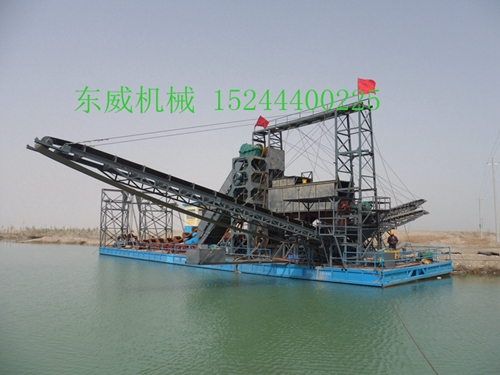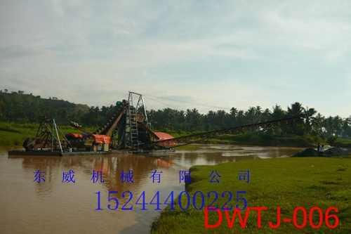 淘金船就是把淘金系统移动到了船上,增加了河沙挖掘系统,在水 面上组成了移动的综合河沙选矿厂。本设备由浮体、挖掘系统、筛分系统、淘 金系统、尾砂排出系统、动力系统、供水系统等组成。