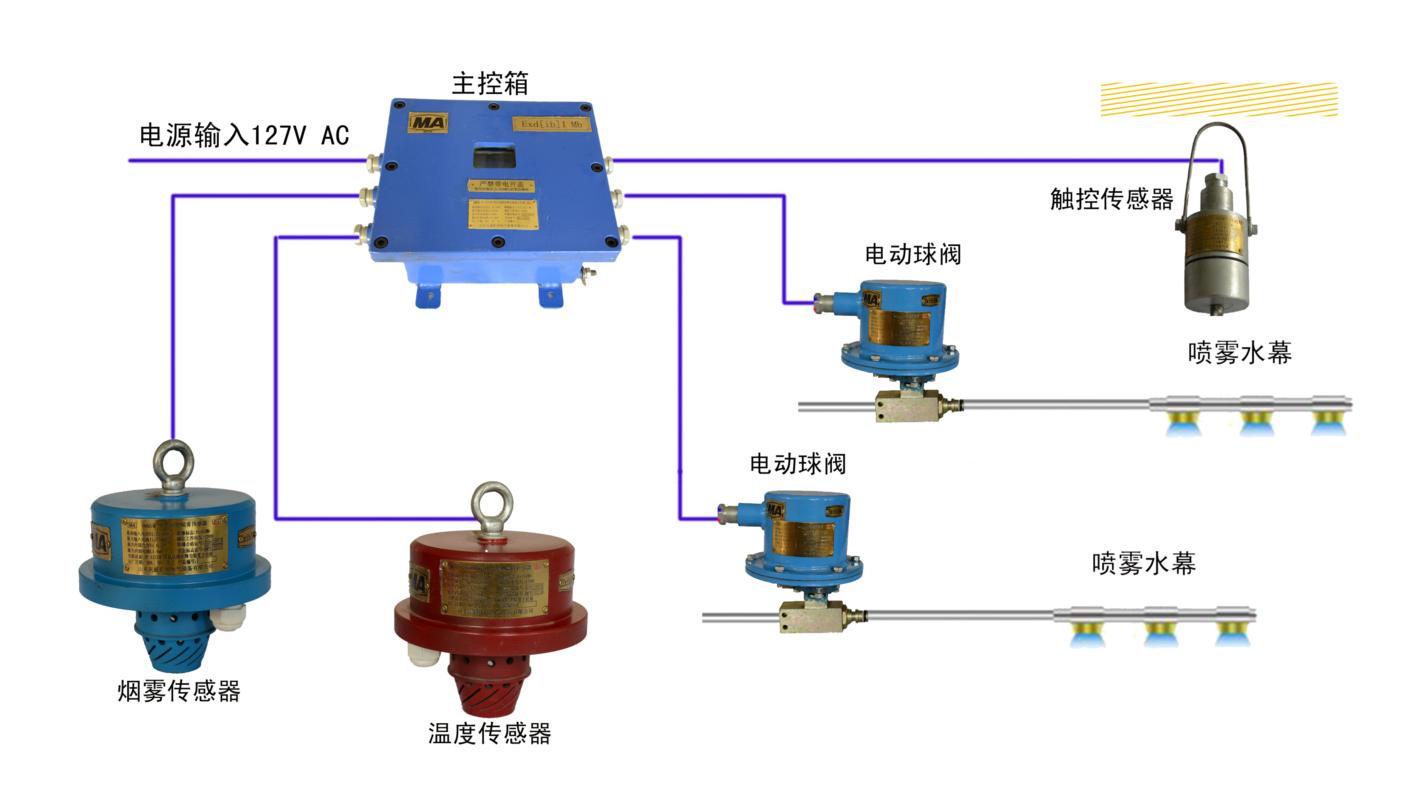 工作原理:触控传感器探测到皮带有物料时,将信号送入主控制箱,当信号连续2秒有效时(为防止误动作而设定),主控制箱开启电动球阀实现防尘喷雾;无物料时延时关闭电动球阀停止喷雾。当温度传感器或烟雾浓度传感器动作时,主控箱立即控制电动阀开启喷雾洒水降温防火。进行洒水防火降尘。无信号时,延时关闭球阀。