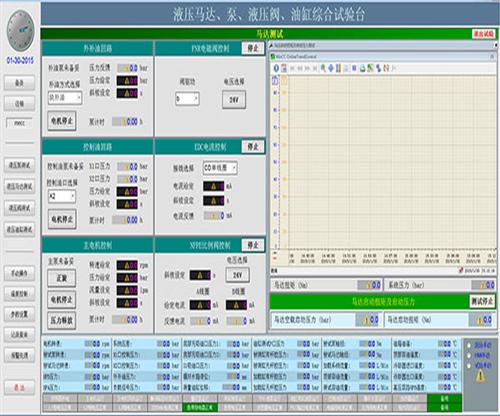 智能检测功能的液压试验台 我公司近些年来开发的液压试验台采用完整的闭式回路,用计算机进行数据采集和处理,保证测量的实时性,采用LabVIEW, cRIO技术对液压伺服系统进行微秒级的高速实时控制及测量,提高测试精度,防止人为误差。显示器全程显示流量、温度、压力及泄漏量(含操作故障)的完整界面。采用AFE型具有无谐波电能回馈功能的大型四象限变频等国际先进的功率回收和节能技术。