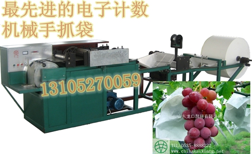 自动制造葡萄套袋加工机器,生产葡萄袋的机器,葡萄套袋机产品特点:简单易学 ,可操作性极强。电动自动上纸,机械手拾袋,电子机械计数,具有出袋整齐,计数准确,节省人力,效率极高;本机采用了国际先进的变频调速技术和电磁刹车系统,可以改装成家用220伏照明用电,更具有安全、方便、节电、降噪的特性; 整机采用全轴承结构,设备运行更稳定、机轴无磨损、整机使用寿命更长;本机采用独特的全同步、双拉力、立体成型、切袋、悬空上胶、镶丝自动调整技术,使得本机在各种果袋生产成型以及对纸的适应性方面得到了最好的完善,从而真正达到了一机多能,即:可在同一台果袋机上生产立体葡萄袋、平面葡萄袋、普通果袋,把普通果袋机与立体果袋机作到了最完美的结合。特别部件采用特殊材料以及特殊加工工艺,整机结构稳定、持久耐用。可生产各种双立体葡萄袋(带刀把、不带刀把);单立体葡萄袋(带刀把、不带刀把);平面葡萄袋(带刀把、不带刀把)各种普通规格果袋。