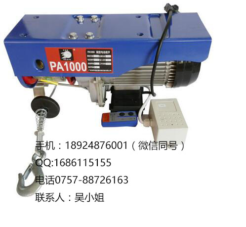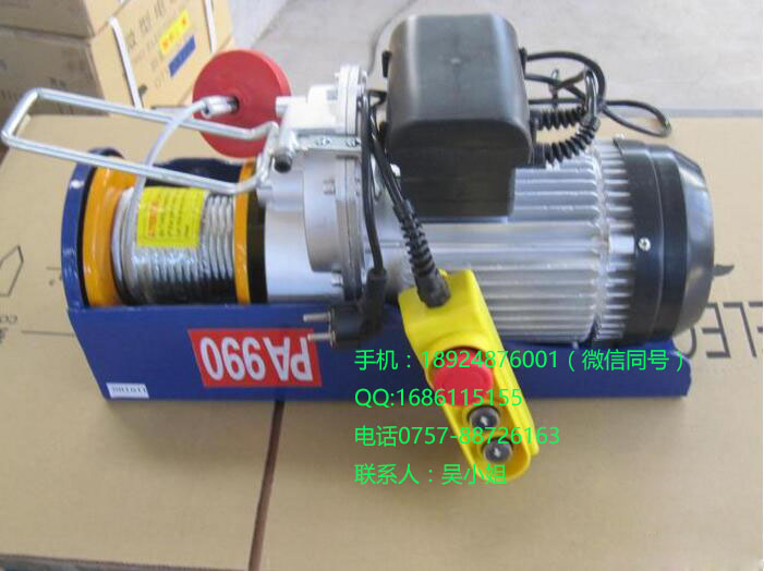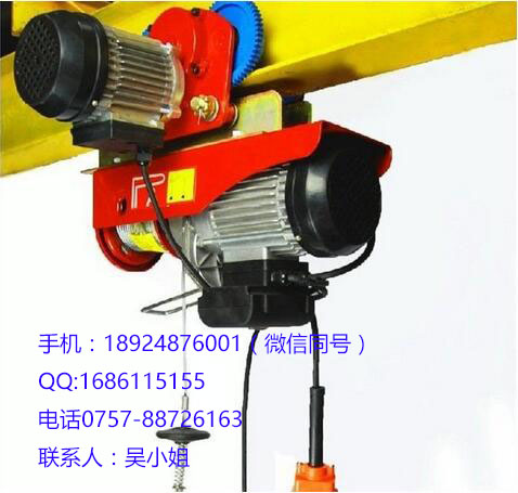 微型电动葫芦的优点:一. 微型电动葫芦设计灵巧,使用方便。二. 当限位挡板碰到限位器时,提升机会自动停止作业。三. 如钢丝绳反向提升,提升机马达会自动停止工作。四. 提升机上钩设计分为动态装货和静态装货两种状态。五. 家用220V电源操作使用。六. 电源线为插入式,使用简便。七. 提升机吊钩可360°旋转