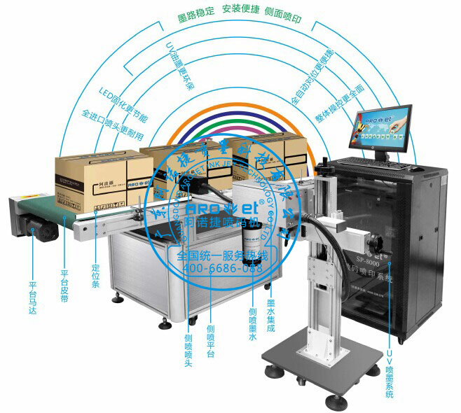 4.完美诠释高速喷印:单个喷头的喷印宽度(也叫高度)为36mm,当分辨率为200DPI时的喷印速度为50米/分钟,通用的UV干燥系统,让机器的后段维护变得更简单,通过LED紫外固化装置使喷印内容快速固化、附着力增强、抗刮抗酒精能力提高。